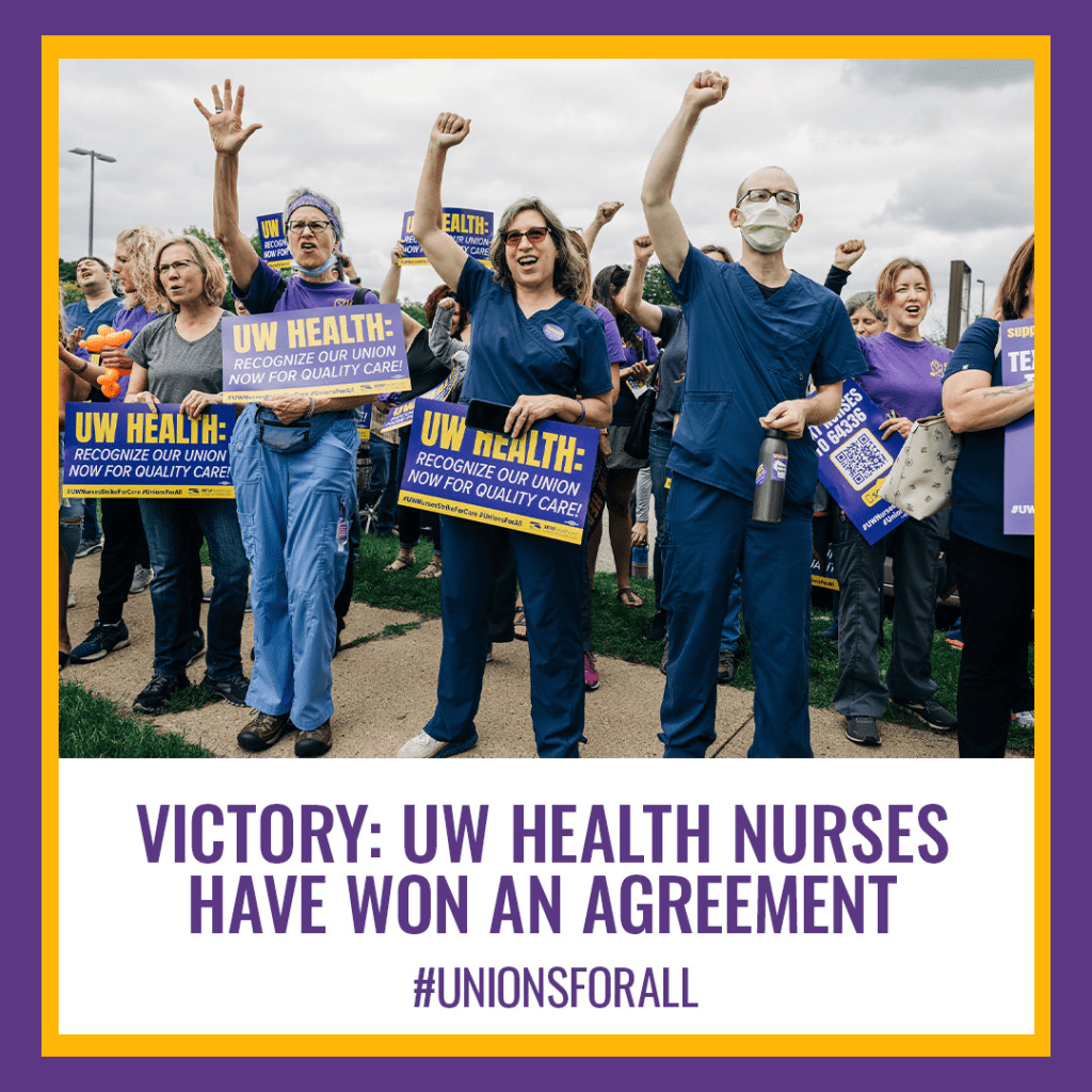 After three long years, nurses just reached an historic agreement with the UW Health board and administration! As a result of this agreement to give UW nurses a voice on the job, our planned strike has been averted. Together, nurses and the administration can solve the deep challenges we’re facing and make sure UW Health is the very best place to work and receive care.