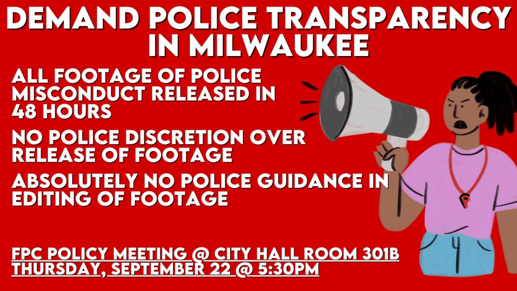 Categories Uncategorized Milwaukee, September 22, 2022: Demand Police Transparency in Milwaukee! Post author By wibailoutpeople Post date September 21, 2022 Event: https://fb.me/e/3AhCDVEsY Share this: Click to share on X (Opens in new window) X Click to share on Facebook (Opens in new window) Facebook Like Loading... Related ← Case New Holland workers’ strike enters fifth month as negotiations stall → Nurses at Ascension Seton Medical Center in Austin, Texas, vote by landslide to join National Nurses Organizing Committee/National Nurses United