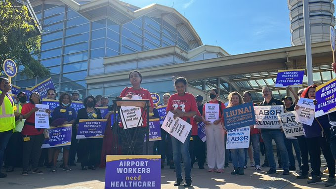 Airport workers and their supporters rallied at National Airport yesterday, saying “One job should be enough for airport workers! Public money should support good jobs!” “If I got hit by a car or a stray bullet, I’d tell the ambulance to take me to work,” said 32BJ SEIU member and contracted cabin cleaner Paul Blair, “Otherwise, I won’t have a job when I come back.” Said NoVA Labor president Ginny Diamond, “Airport workers deserve the fundamental human right to form a union!” And 32BJ’s Jaime Contreras noted that while MWAA in 2018 enacted a policy requiring contractors to provide a living wage for airport workers at Dulles and National, “MWAA also has the power to enact a policy requiring contractors to provide paid sick leave and health care benefits.” photo: airport workers Yardanos and Nigist