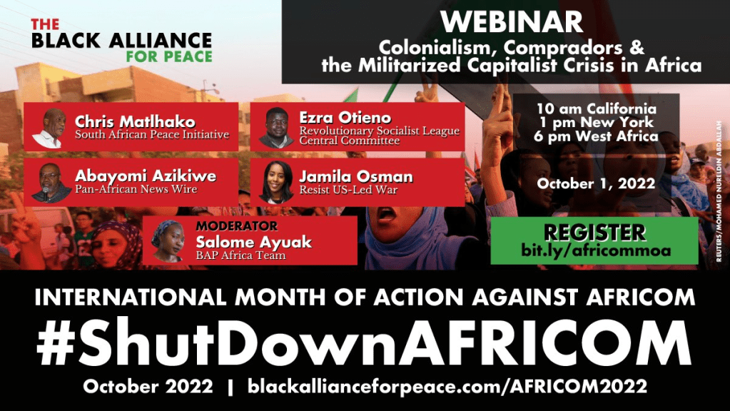 Join the Black Alliance for Peace for this cutting edge webinar that will kick off the 3rd International Month of Action Against AFRICOM. Hear analysis from organizers in hotspots on the ground in Africa and others with uncompromising and lucid views on the state of affairs in Africa and strategies to get the “U.S. Out of Africa” and “Shut Down AFRICOM.”