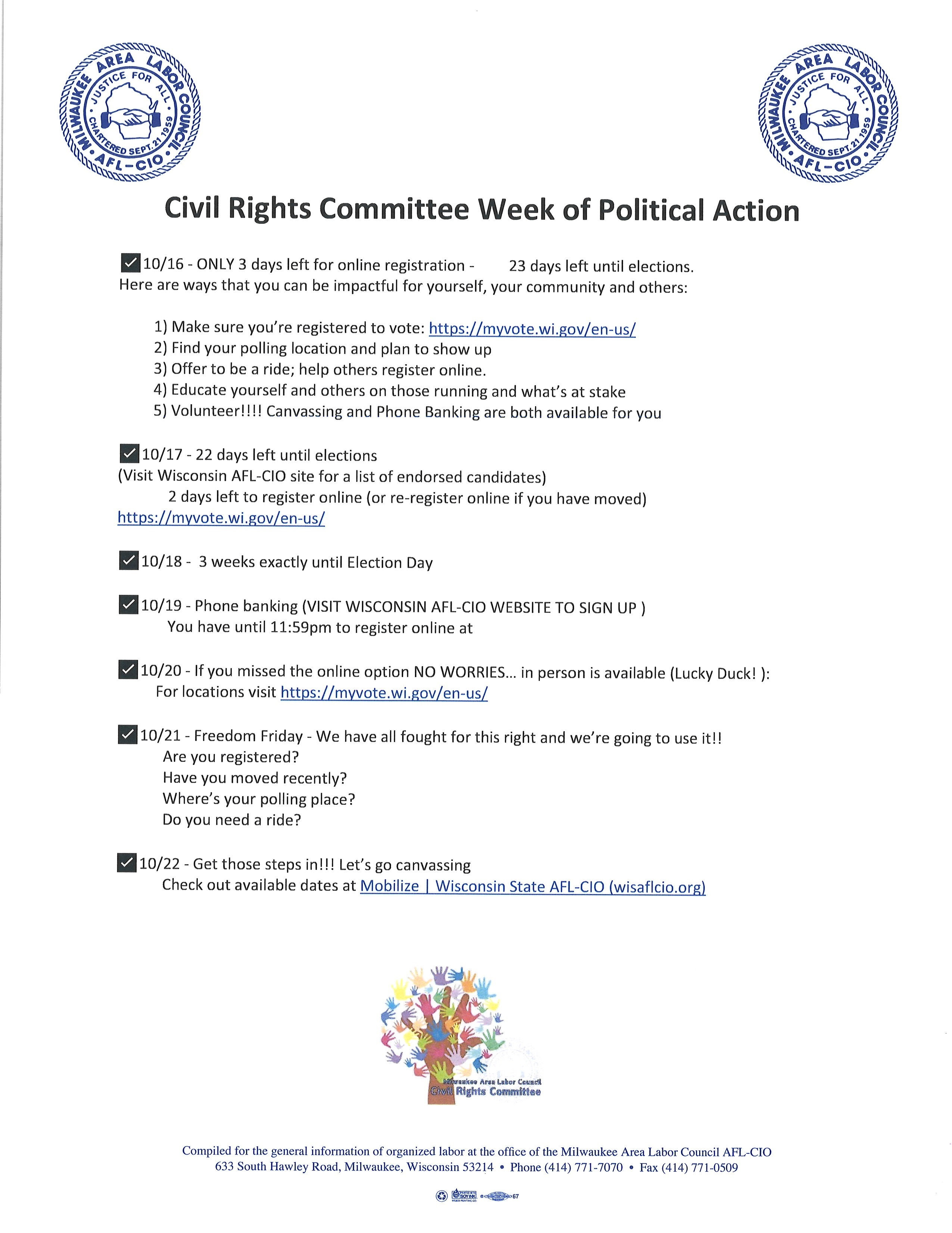 Categories Uncategorized Milwaukee Area Labor Council: Week of Political Action, Register and Defend the Right to Vote & Canvassing Opportunities Post author By wibailoutpeople Post date October 13, 2022 Share this: Click to share on X (Opens in new window) X Click to share on Facebook (Opens in new window) Facebook Like Loading... Related ← Cuba in the eye of Washington’s hurricane → Jewish Voices For Peace: Support students who refuse to build tech for apartheid