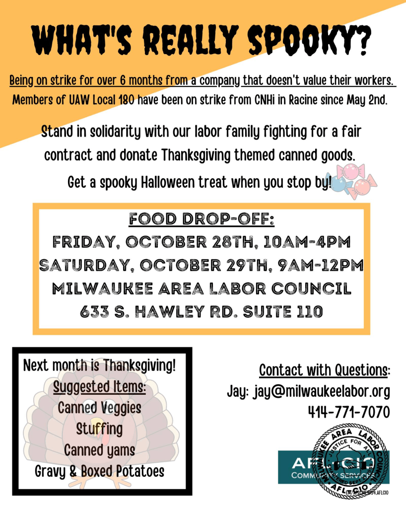 Categories Uncategorized Solidarity With UAW 180 Members! On Strike For 6 Months Against CNHi (Case Holland) Post author By wibailoutpeople Post date October 18, 2022 UAW Local 180 Share this: Click to share on X (Opens in new window) X Click to share on Facebook (Opens in new window) Facebook Like Loading... Related ← Milwaukee, October 22, 2022: Ms. Lucille Berrien Park Celebration – One Year Anniversary of Park Renaming → Milwaukee: Free Rides to the Polls