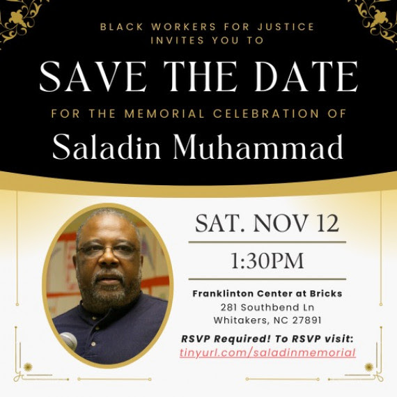Categories Uncategorized Whitakers, NC, November 12, 2022: Memorial Celebration of Saladin Muhammad Post author By wibailoutpeople Post date October 21, 2022 tinyurl.com/saladinmemorial Black Workers for JusticePO Box 26774Raleigh, NC 27611 Share this: Click to share on X (Opens in new window) X Click to share on Facebook (Opens in new window) Facebook Like Loading... Related ← Settler attacks in West Bank drive farmers to treetops → Fruit Of Labor – Black Workers For Justice