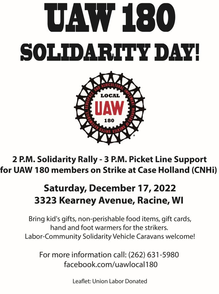 Categories Uncategorized UAW 180 Solidarity Day! December 17, 2022 in Racine, Wisconsin Post author By wibailoutpeople Post date November 10, 2022 UAW Local 180 Share this: Share on X (Opens in new window) X Share on Facebook (Opens in new window) Facebook Like Loading... Related ← “The Wreck of the Edmund Fitzgerald” – Gordon Lightfoot (HD w/ Lyrics) → Milwaukee: Wisconsin Network for Peace & Justice Annual Assembly November 13, 2022
