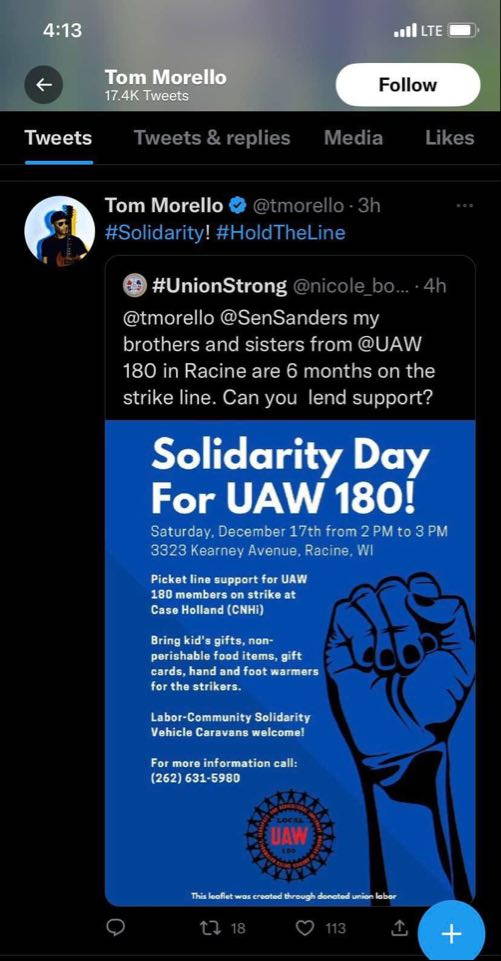 Categories Uncategorized Musician Tom Morello – Solidarity for UAW 180 and 807 On Strike Against CNHi (Case Holland) – All Out for Solidarity Day in Racine December 17, 2022! Post author By wibailoutpeople Post date November 16, 2022 Share this: Click to share on X (Opens in new window) X Click to share on Facebook (Opens in new window) Facebook Like Loading... Related ← Donate to the UAW 180 Holiday Food Drive! Food Drop Off at the Milwaukee Area Labor Council – Drop Items Off December 2-3, 2022 → November 17, 2022: Starbucks Workers United Strikes Nationwide! Red Cup Day!