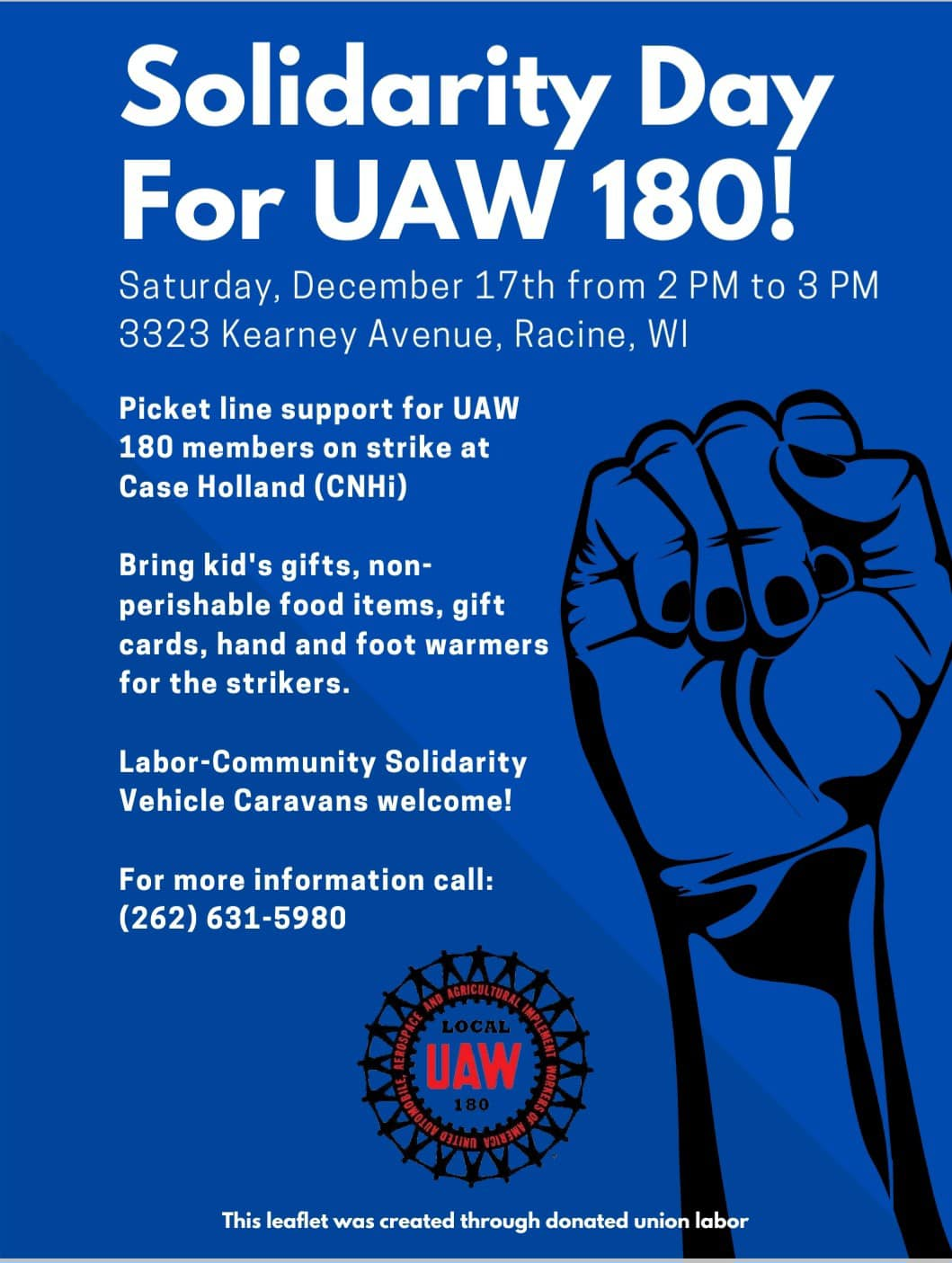 Standing with our brothers and sisters at CNH UAW Local 180 and Uaw Local 807 , UofC UAW Local 2865, UC Student-Workers Union , and NYU ACT-UAW Local 7902 all on strike right now. UAW Solidarity! – And UAW Local 2110