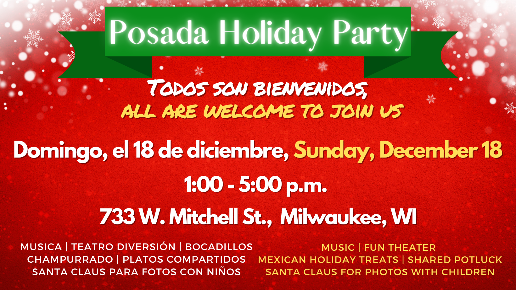 | Dear Bryan, Please join us, this Sunday, December 18th, to celebrate the holiday season with a Voces de la Frontera Posada Holiday Party. Since the pandemic has prevented us from gathering in the past few years, we are especially excited to see everyone and come together over food, music, family, and fun. Everyone is welcome to join us, and the event is family friendly! We’ll even have a Santa Claus available for photos with children. Voces will provide Mexican holiday treats like ‘bocadillos’ and ‘champurrado’, and while not necessary, feel free to bring a small plate or dessert to share. *R.S.V.P. is not required, but if possible, please contact Cassandra at 414-384-4275 (call or text) so that we can best accommodate everyone. Event Details: What: A Posada Holiday Party with music, fun theater, Mexican holiday treats, and a Santa Claus for children. Who: All members and their family and invited guests, and Voces staff and volunteers When: Sunday, December 18th, 2022 from 1:00 p.m. – 5:00 p.m. Where: The New Voces Milwaukee Office, 733 W. Mitchell St., Milwaukee WI See you there! Happy Holidays! |