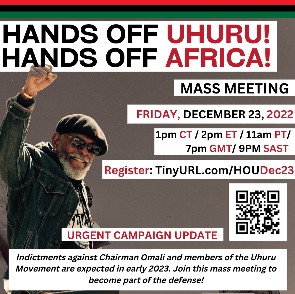 You are invited to attend an Emergency Hands Off Uhuru! Hands Off Africa! Defense Campaign Mass Meeting on Friday, December 23, 2022 @ 1pm CT/ 2pm ET / 7pm GMT / 9pm SAST / 11am PT