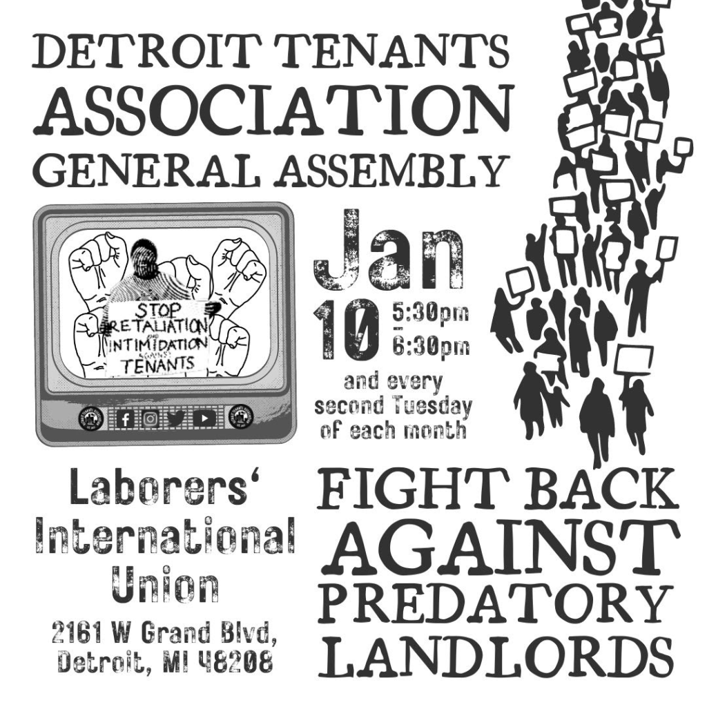 Join us as an ally at the DTA General Assembly meeting that will take place at 5:30pm on January 10 2023 at the Laborers’ International Union, located at 2161 W Grand Blvd, Detroit, MI 48208. This meeting will be 1-hour long. Please share/forward this email to all Detroit renters that are connected with your organization. All tenants of Detroit are welcome to join the DTA!