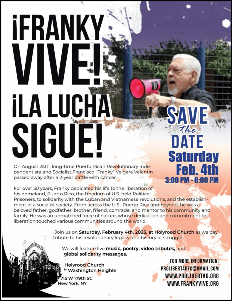 Categories Uncategorized Celebrating the Life of Franky Velgara Valentin Feb. 4, 2023 in NYC Post author By wibailoutpeople Post date January 15, 2023 ¡Franky Vive! ¡La Lucha Sigue!Celebrating the Life of Franky Velgara Valentin Join us on Saturday, February 4th, 2023at Holyrood Church as we paytribute to his revolutionary legacy and history of struggle. Share this: Click to share on X (Opens in new window) X Click to share on Facebook (Opens in new window) Facebook Like Loading... Related ← MLK April 1967 Speech in NYC: ‘Beyond Vietnam – A Time To Break The Silence → Mrs. Coretta Scott King and the Labor Movement