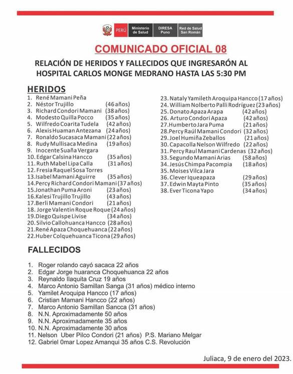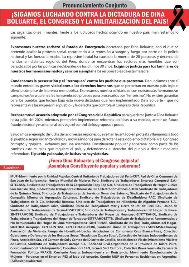 We reject the State of Emergency decreed by Dina Boluarte, which intends to silence social protest, resorting to repression with blood and fire by the national police and the armed forces. The brutal repression has caused the death of 28 people and dozens of wounded in different regions of Peru, where the most humble sectors, who have been harmed by the neoliberal policies of the last 30 years, are located. We demand justice for the families of our murdered loved ones and exemplary punishment for those responsible for this massacre.