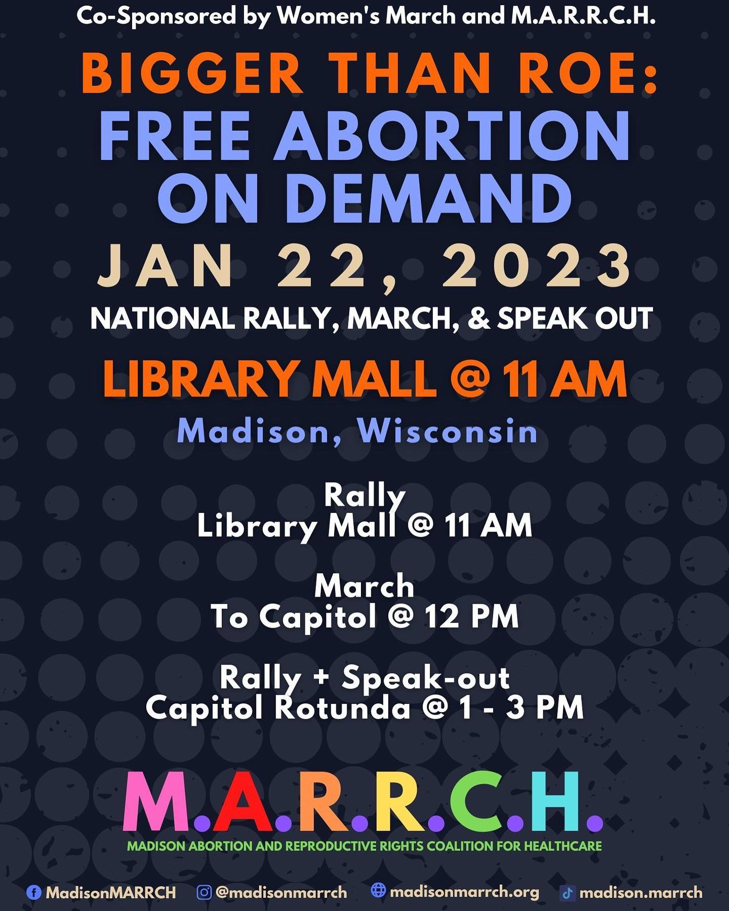 January 22nd, 11 AM @ Library Mall (note the time change!). Rally / march / speak-out. In honor of the 50th anniversary of Roe V. Wade, MARRCH and our community partners will be taking to the streets to demand an end to the 1849 abortion ban and a return of bodily autonomy for all! This national rally, march, and speak-out will be huge.