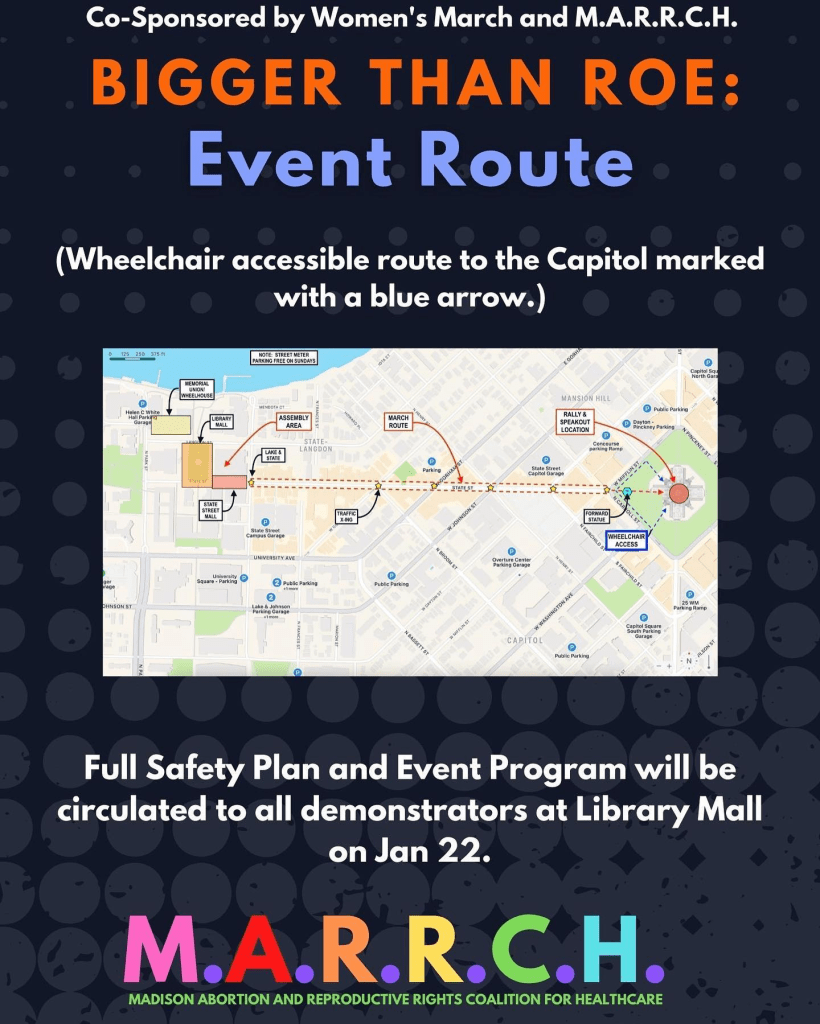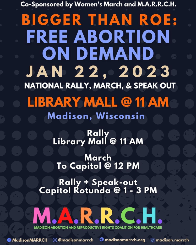 Coalition Meet-and-Greet – January 18th, 4:30 PM, Zoom – Event planning meeting with our 30+ coalition members, including labor organizers, healthcare workers, abortion defenders, abolitionists, black rights groups, and trans rights advocates. We will be discussing event logistics, ways coalition members can get involved in planning, and how our coalition can continue to work together after Jan22 to protect reproductive justice in Wisconsin. All community members welcome! Zoom link: bit.ly/Jan22PlanningMeeting4