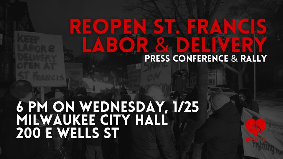 The Coalition to Save Saint Francis is gathering to demand that the City Council take action to maintain labor and delivery services on the South Side of Milwaukee! Just before the holidays started, Ascension made the decision to lay off all employees who worked in the labor and delivery unit at Saint Francis hospital. The city must take action to ensure that immigrants and working class people have access to adequate healthcare!