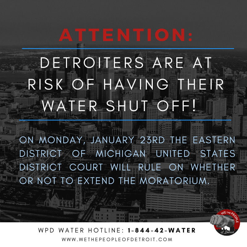 Find out on Monday, January 23rd, at the public hearing where the Honorable Denise P. Hood, will decide if the moratorium on water shutoffs in the city of Detroit will be extended or if the Detroit Water and Sewerage Department can resume water shutoffs as a means to collect past due water bills.