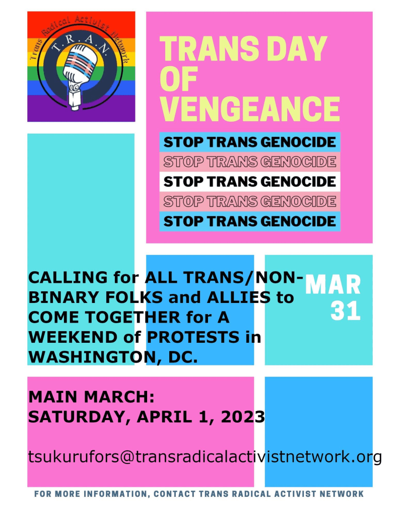 TRAN will be hosting an event in DC, time and location TBA on 3/31-4/1. The online event will be hosted on 4/1-4/2, time TBA. If anyone is interested in organizing in their state, please fill out the contact form. If anyone is new to organizing TRAN will be providing an organizing guide to assist, please be sure to express this on the contact form.