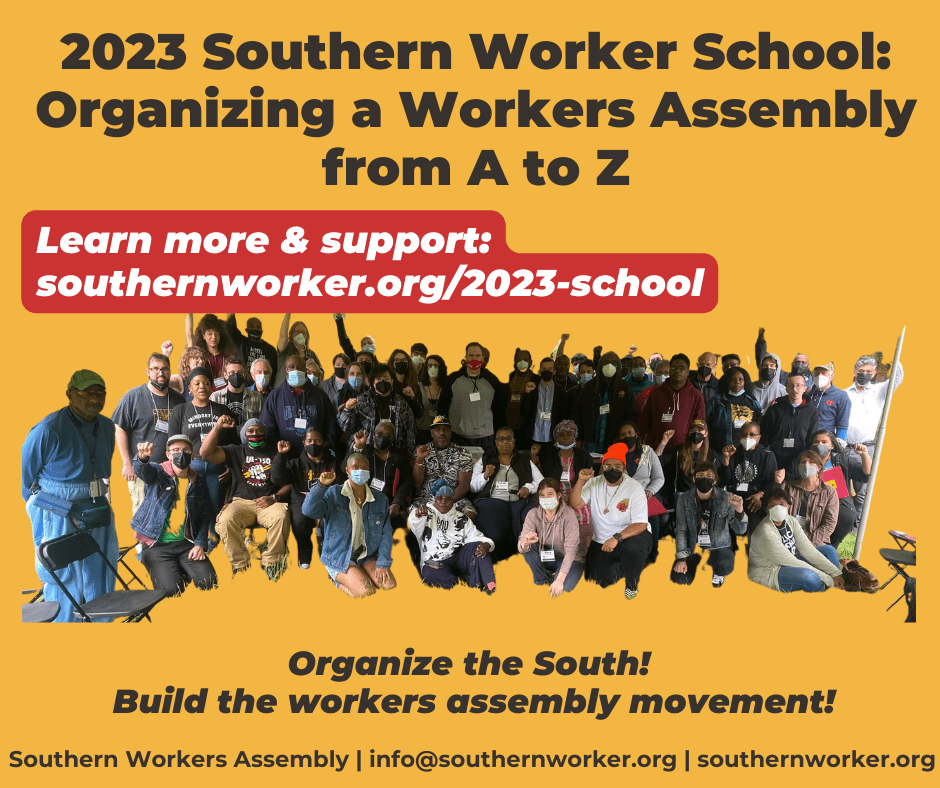 This year, we are organizing participation in the worker school a bit differently than we’ve done in the past. We would also like to extend an invitation to other workers and activists in the South who are not yet engaged in building a workers assembly, but who are interested in learning more and developing one in your area, to join us as well. If this applies to you, please reach out to us at info@southernworker.org for additional information about participating.