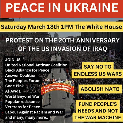Coinciding with the 20th anniversary weekend of the criminal U.S.-invasion of Iraq, a major set of actions including a demonstration at the White House in Washington, D.C. on Saturday March 18 demanding “Peace in Ukraine – Say NO to Endless U.S. Wars” and “Fund People’s Needs, Not the War Machine.” Since 2003, the U.S. has engaged in sanctions (economic war) on more than 40 countries. These targets of U.S. economic warfare include the people of Cuba, Zimbabwe, Venezuela, Ethiopia, Eritrea, Iran and many other nations. Even in the wake of the worst disasters, like the recent deadly earthquake, Washington keeps its cruel sanctions in place against Syria. U.S. bases and “commands” blanket most of the world. It is a global empire.