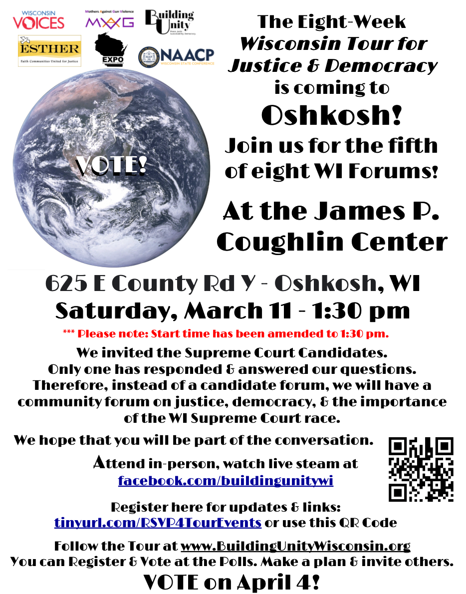 The Forum will be live-streamed to Facebook and may also be available to the public by Zoom. Register here for the Zoom Connection: https://bit.ly/scforum-OSHKOSH