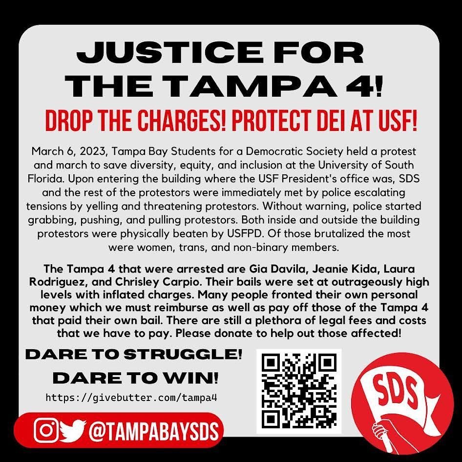 On March 6th, multiple USF students were brutalized and arrested by USF campus police, even though these young people were merely exercising their constitutional right to peacefully protest Gov. DeSantis’s attacks on DEI. You can read more about this story here and here.