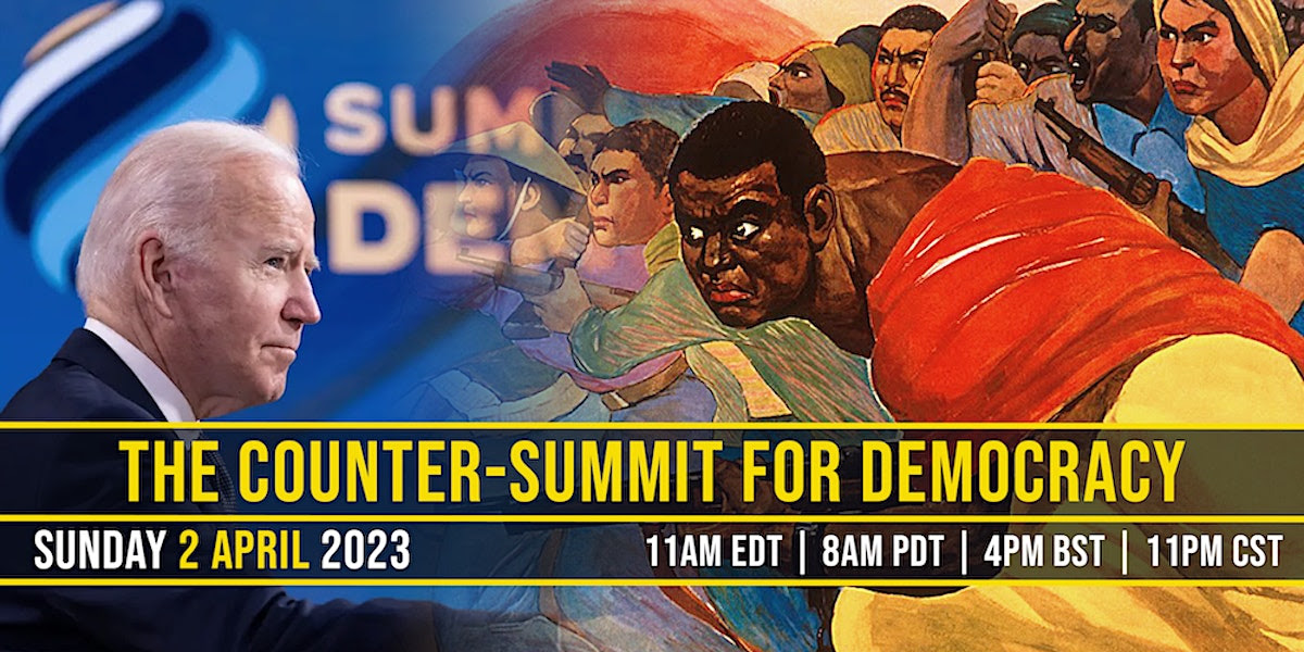 Our next webinar, jointly organised with the International Manifesto Group, will take place on Sunday 2 April 2023 (11am US Eastern / 4pm Britain). Held to coincide with Biden‘s Summit for Democracy 2023, this Counter-Summit will: expose the hegemonic reality behind the US’s talk of a ‘rules-based world order’; explore alternative models of democracy; denounce US-led attempts at ‘decoupling’ and incitement of division; promote an emerging multipolar, multilateral model of international relations; and call for global cooperation to solve the vast problems collectively faced by humanity.