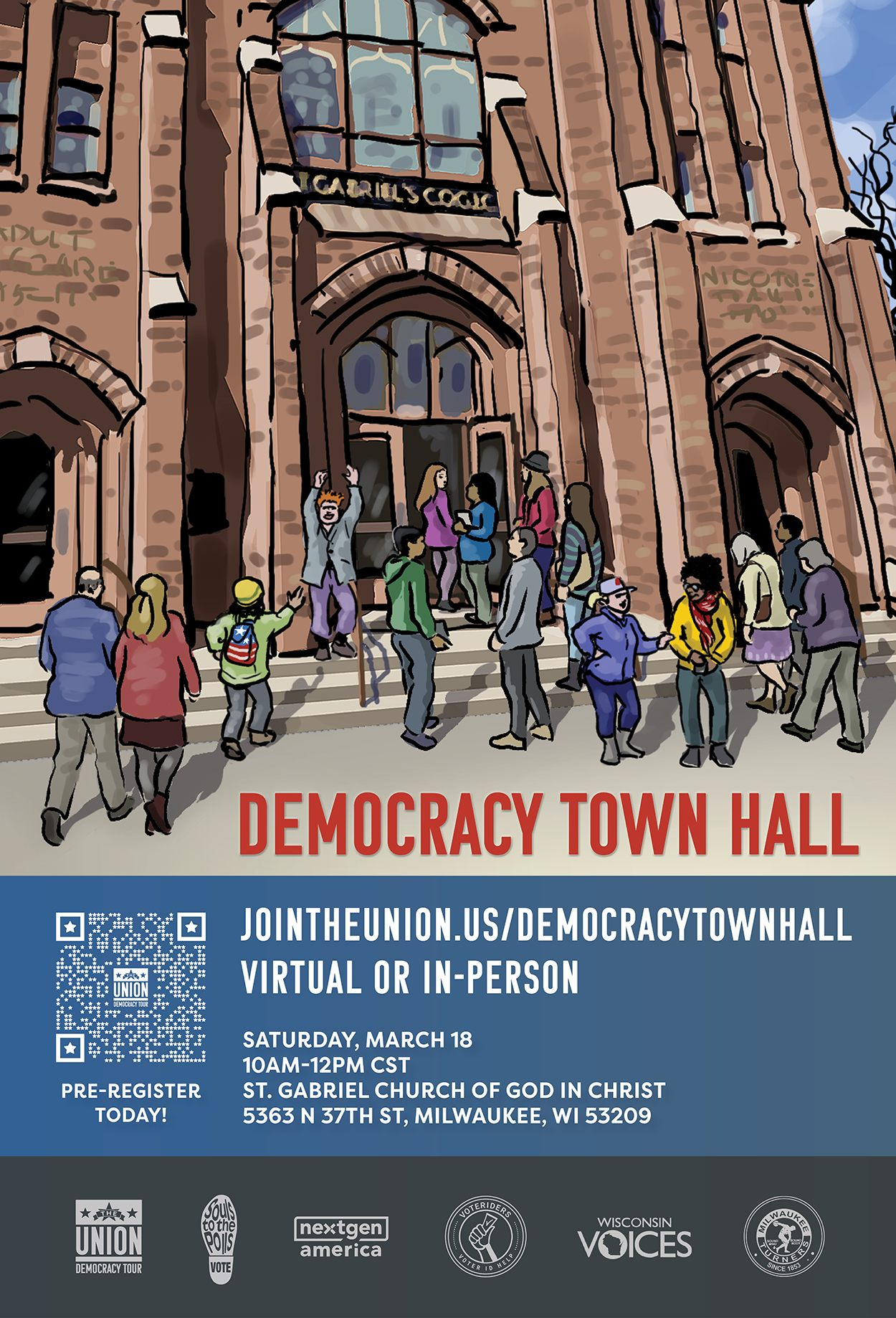 Join us on Saturday, March 18, 2023 from 10am – 12 noon at St. Gabriel’s Church of God in Christ (5363 N 37th Street, Milwaukee). Sign up to attend in-person or watch virtually at jointheunion.us/democracytownhall