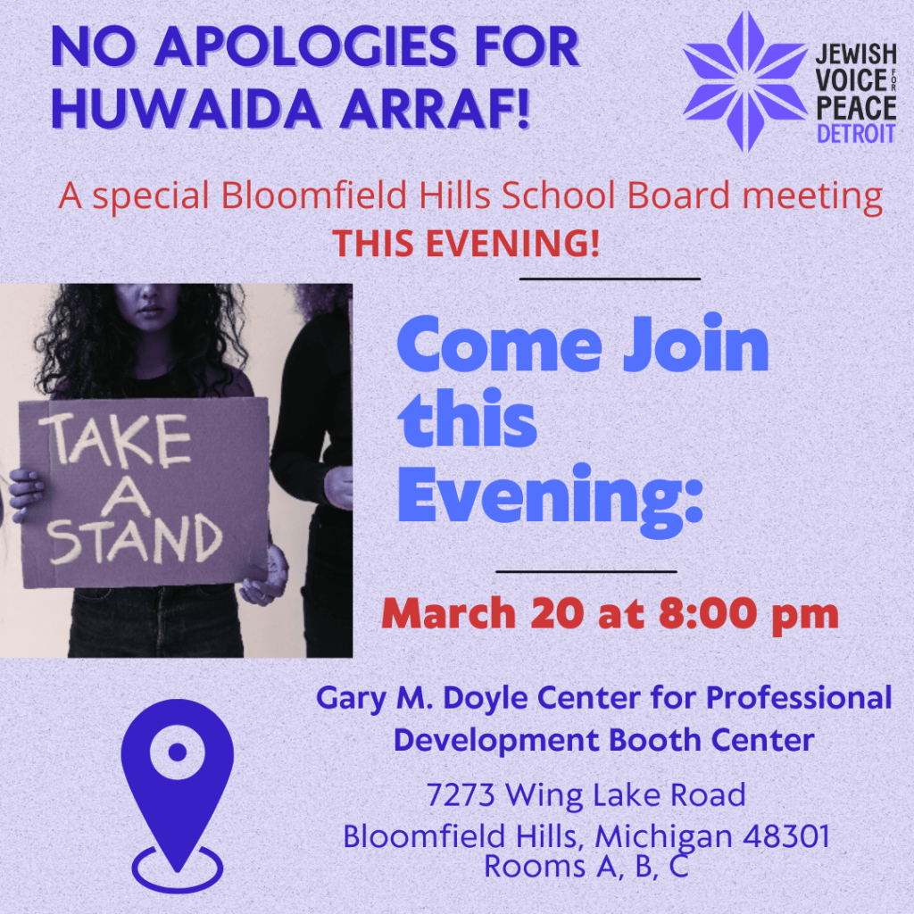 Jewish Voice for Peace Detroit stands with Palestinian activist attorney Huwaida Arraf, who is under attack with false smears of anti-Semitism after speaking in support of Palestine as an invited speaker at a Bloomfield Hills High School diversity event on March 14. Bloomfield Hills Schools has caved to pressure against these false accusations.