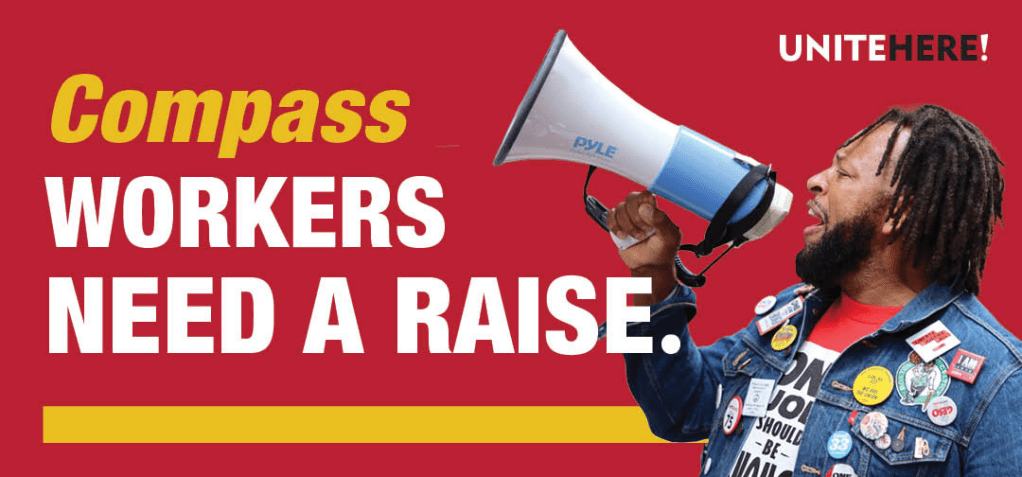 As reported at yesterday’s MWC Delegates Meeting, Compass cafeteria workers in Washington, D.C. are demanding a raise. Members of UNITE HERE 23, they feed the students at prestigious universities including George Washington University, American University, Catholic University of America, and Gallaudet University. Compass cafeteria workers prepare meals for visitors and staff at some of the most-visited museums in the country such as the Smithsonian, and at the World Bank. “While Compass cafeteria workers show up every day to serve at these wealthy and renowned institutions in our nation’s Capital,” says an online petition, “they struggle to pay their bills. Join food service workers in their fight to share in the prosperity — Compass workers need a raise!”