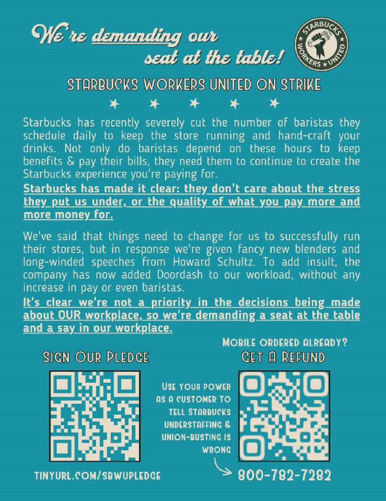 Starbucks workers are staging a National ULP strike today. “The message of the strike is getting a seat at the bargaining table,” reports Chris Roell of Workers United. In the metro DC area, workers at the Arlington Courthouse and Olney Md Starbucks are striking. The Arlington picket line is 7:30a-11:30a, Olney picket line: 7;00am – Noon. There are also actions at these DC locations: 1730 Pennsylvania Avenue (10a); 1455 K St., NW (9a); 14th & H St NW (10:30a); 1401 New York Ave NW (10:30a); Foxhall Square (AU), 3301 New Mexico Ave NW (9a). Details here.