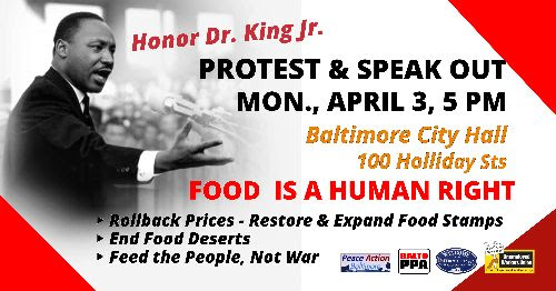| Protest & Speak Out Stop Food Stamp Cuts & Rollback Prices Monday, April 3, 5 pm Baltimore City Hall, 100 Holliday St 21202 Commemorating the April 4, anniversary of the assassination of Dr. King Jr. FOOD IS A HUMAN RIGHT SIGN UP ON FACEBOOK Restore Food Stamp Cuts and Expand Food Stamps – Inflation is an Emergency Rollback Prices – End Food Deserts Feed the People, not the War Machine Sponsored by: Peoples Power Assembly, Matthew Henson Neighborhood Association, Unemployed Workers Union, Baltimore Peace Action (partial list) ABOUT OUR CAMPAIGN Baltimore community groups are joining together to fight for people’s right to affordable, nutritious food. If Under Armour can receive “opportunity zone” status and downtown businesses can receive financial benefits, why not Baltimore’s neighborhoods. We believe that it is time to put an end to food apartheid in Baltimore. When we began our work there were four areas that we identified as ‘food deserts’ including West Baltimore, Pigtown, Oliver East and Cherry Hill. Those boundaries have widened and with growing inflation most communities, with the exception of wealthy areas, are facing hardship and hunger. We need to rollback prices now! This is why we are submitting the following proposals. Where it is possible, we welcome government officials negotiating with existing supermarket chains to locate in these neighborhoods. But we cannot wait or rely on the good will of for-profit food chains. Comprehensive action is needed now on a City, State and Federal level! It includes City Council members, the Mayor, and the Governor. Our Plan: – Public owned & subsidized markets at the previous sites of closed markets or at locations designated by the community. – Train and hire residents from each affected area. – Protect and guarantee union rights for all workers in subsidized supermarkets. Rollback food prices – Restore emergency allotments for food stamps to address the inflation crisis. – Lower requirements to extend food stamp programs especially for seniors & low wage workers. – Workers and peoples control board to rollback and freeze prices – Enact penalties for price gougers Support and fund Black owned food-coops, gardens & farms – Community control of vacant city lots for people’s gardens. Enact transportation & food distribution plan for seniors, youth, disabled and poor residents – Weekly bus routes to supermarkets from affected communities. – Delivery of food to those in need and emergency preparation. Community control of redevelopment – Form Community Action Committees in each area. – Citywide Commission made up of representatives from affected communities to determine action. Mayor & City Council call for national aid – over $100 billion has already been spent on the U.S./ NATO proxy war on Russia, Time to feed the people, not the Pentagon! |