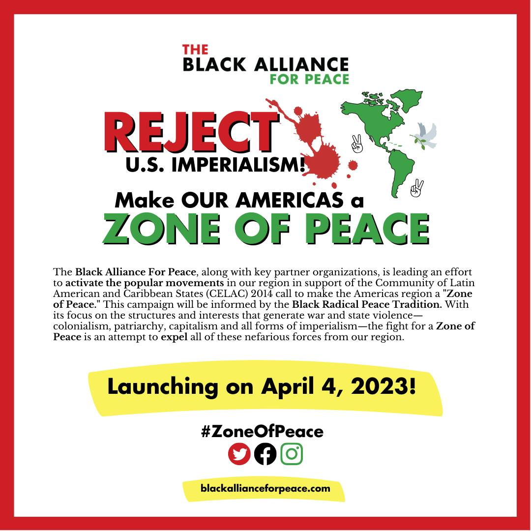 The Black Alliance for Peace, along with key partner organizations, is leading an effort to activate the popular movements in our region in support of the Community of Latin American and Caribbean States (CELAC) 2014 call to make the Americas region a “Zone of Peace.” This campaign will be informed by the Black Radical Peace Tradition. With its focus on the structures and interests that generate war and state violence—colonialism, patriarchy, capitalism and all forms of imperialism—the fight for a Zone of Peace is an attempt to expel all of these nefarious forces from our region.