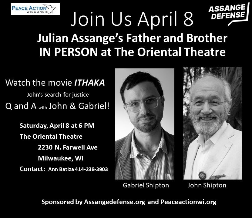 Categories Uncategorized ITHAKA Moving Screening April 8, 2023 – Julian Assange’s Father and Brother In Person at The Oriental Theatre Post author By wibailoutpeople Post date April 2, 2023 Assange Defense Share this: Click to share on X (Opens in new window) X Click to share on Facebook (Opens in new window) Facebook Like Loading... Related ← Judge Rules Against a New Trial for Mumia Abu-Jamal March 31, 2023 – Protests Called Nationwide → Milwaukee Area Labor Council Civil Rights Committee – April 2023 Meetings