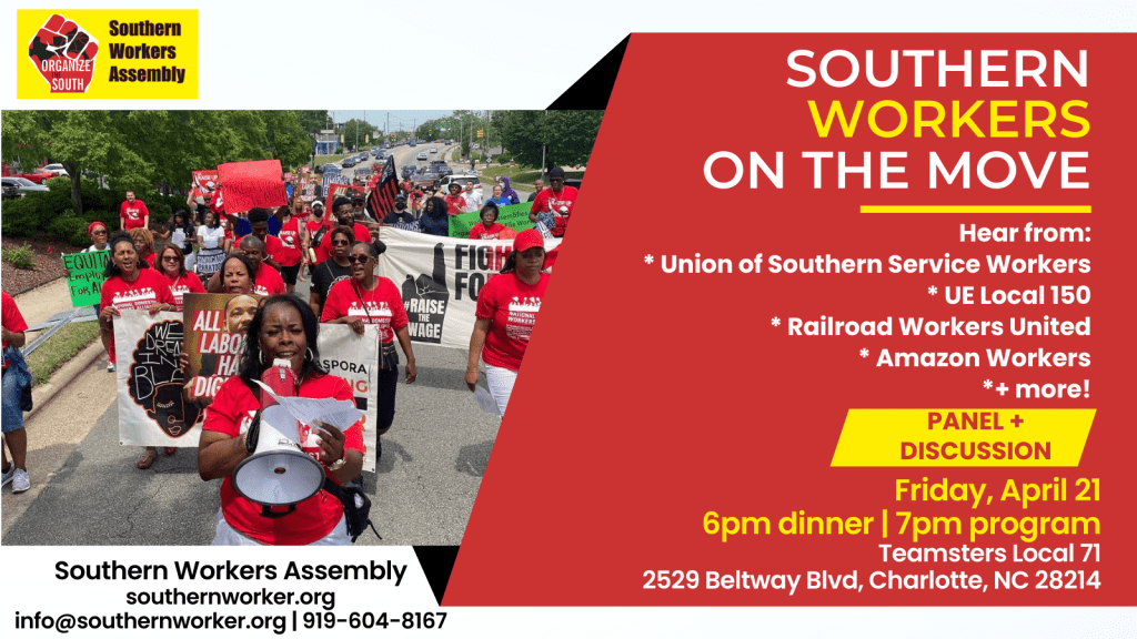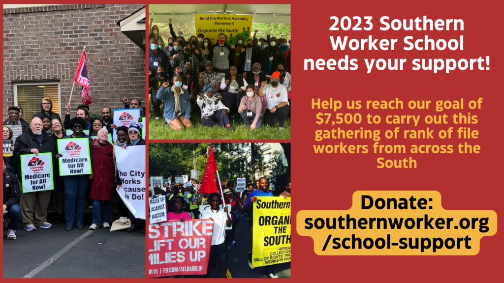 | We need your support to make it happen. Please consider making a donation of any size that will go directly towards the many costs associated with the gathering – including printing, food, space rentals, support provided to enable rank and file workers from various sectors to participate in the Southern Worker School, and more. Onwards to build a powerful workers movement and organize the South! In solidarity, Southern Workers Assembly |