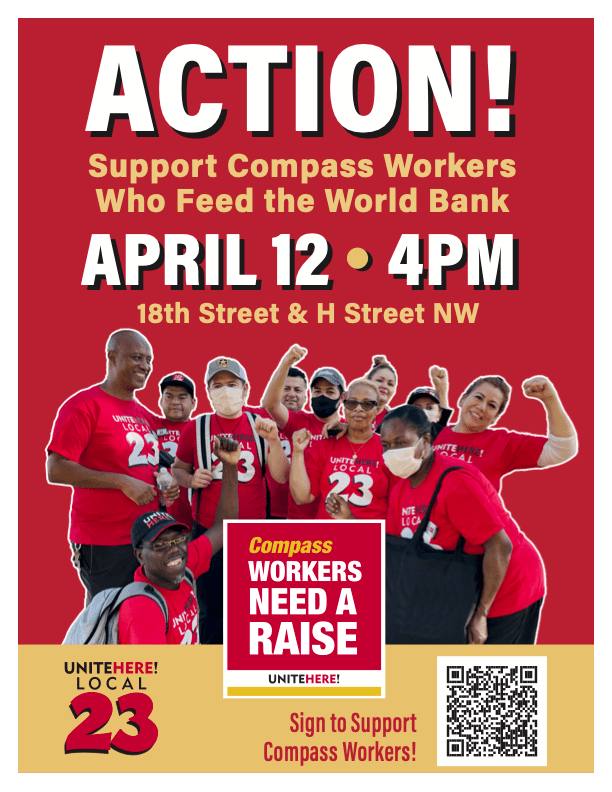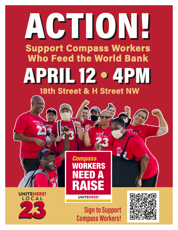 Workers at the Compass-operated cafeteria at the World Bank will picket this afternoon at 4p (see Calendar). The workers, members of UNITE HERE 23, are in negotiations for new union contracts that keep up with the cost of living. Last week Local 23 released the results of a survey that detailed the ways workers struggle to afford necessities like food and housing. “Compass cafeteria workers feed some of the most prestigious and influential institutions in our nation’s Capital,” said UNITE HERE President D. Taylor, “yet they’re struggling to pay their bills. Compass is the largest food service contractor in the US. Food service workers have been really whacked by inflation, but workers are in a position of power right now to advocate for change. We plan to fight hard to turn these jobs, and all hospitality jobs, into jobs you can live on in DC.” Read more here.