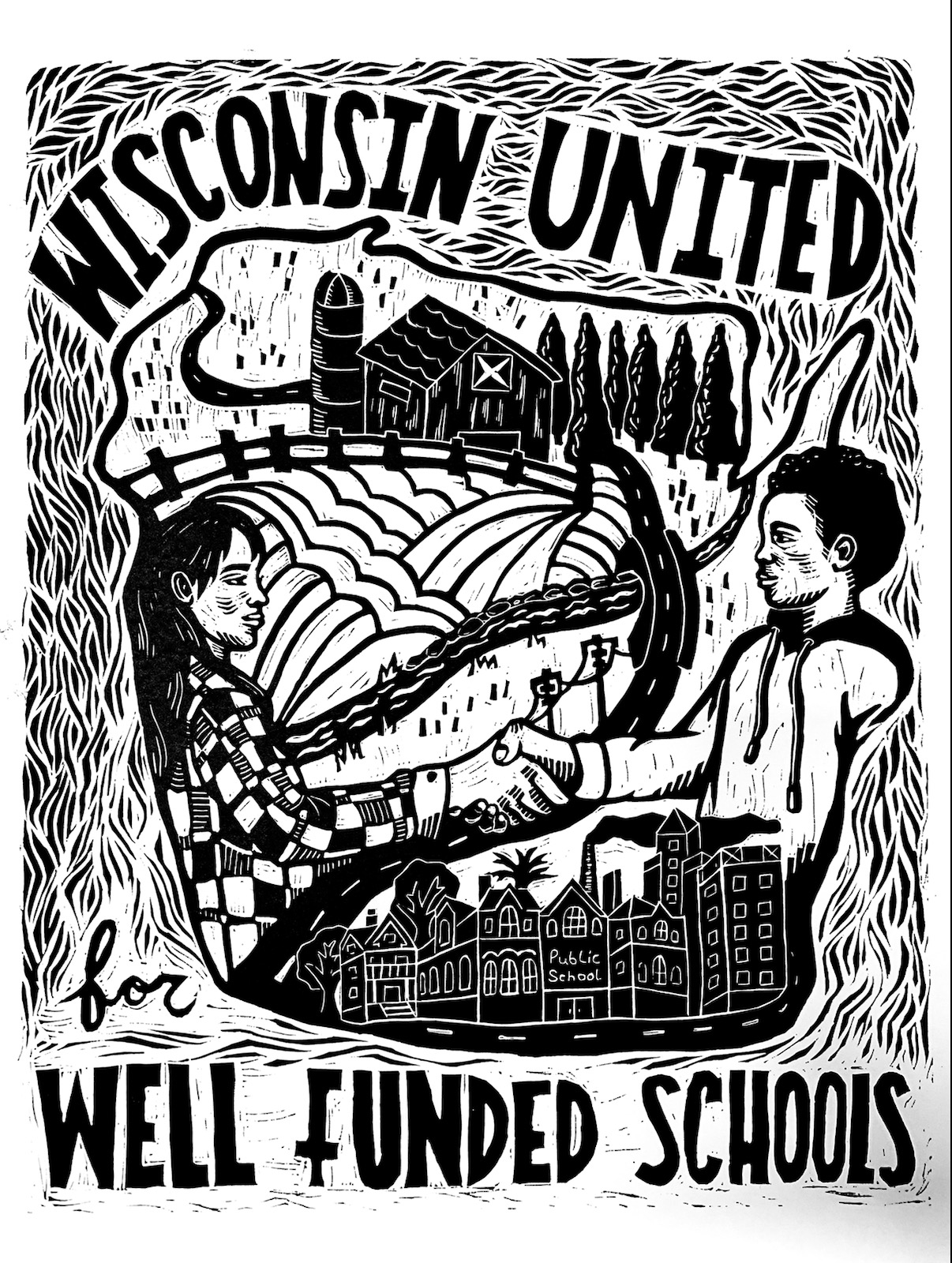 Riverside University High School Art Teacher Paige Bauske designed this moving banner for this weekend’s Community Art Build to Win Greater State Funding for Public Education at South Division High School. Paige’s design highlights the desire of Wisconsin urban, rural, and suburban voters, who polling have consistently shown, want greater funding for public education.