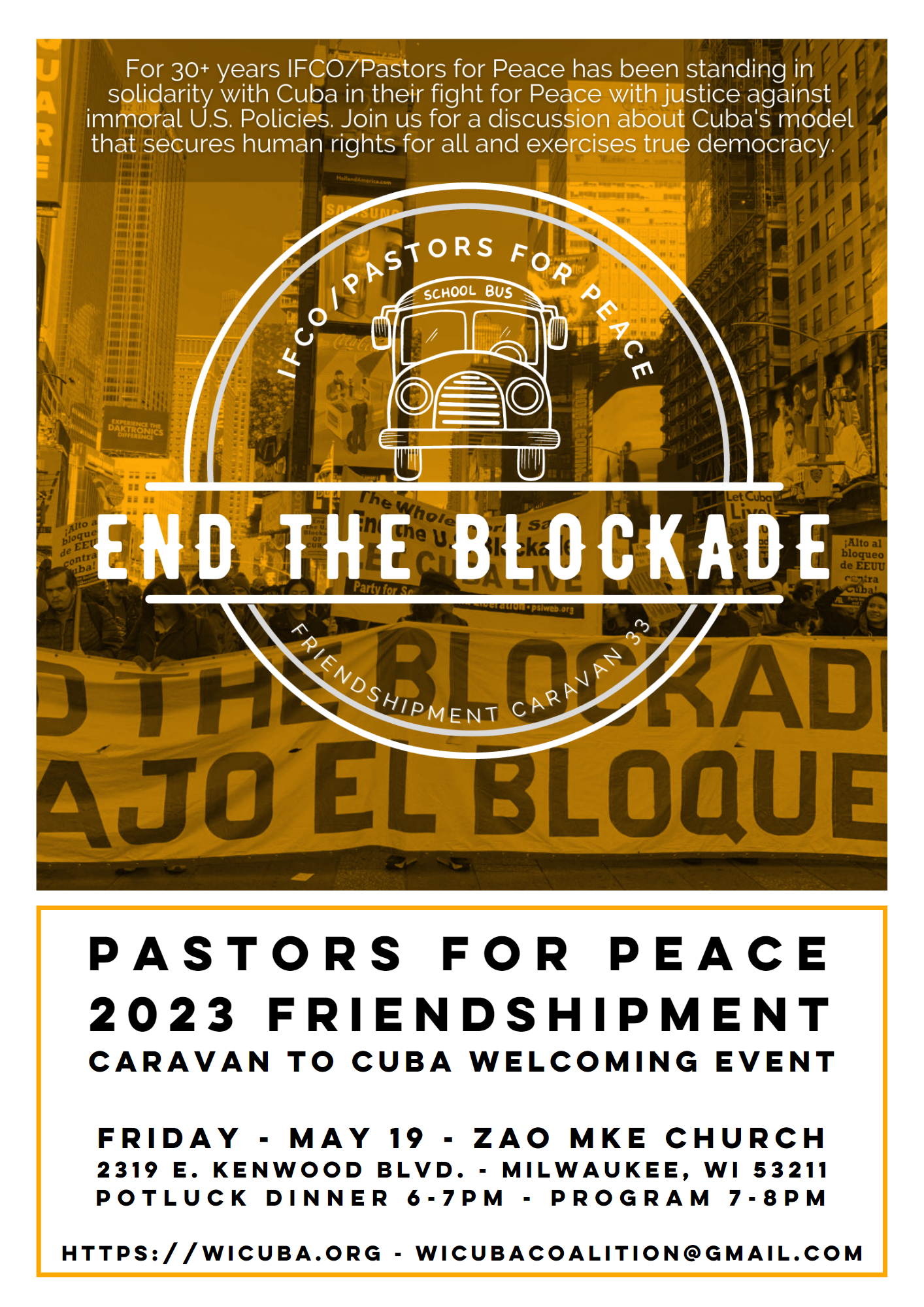 Categories Uncategorized Pastors For Peace End the U.S. Blockade on Cuba! – Milwaukee Stop May 19, 2023 Post author By wibailoutpeople Post date April 16, 2023 https://wicuba.org/ Share this: Share on X (Opens in new window) X Share on Facebook (Opens in new window) Facebook Like Loading... Related ← Testify on the State Budget April 26, 2023 in Minocqua and Online / Money for the People Not the Bankers, Corporate Welfare and the Endless U.S. War Machine! → San Antonio Alliance of Teachers & School Personnel Wins Largest Wage Increases In District History
