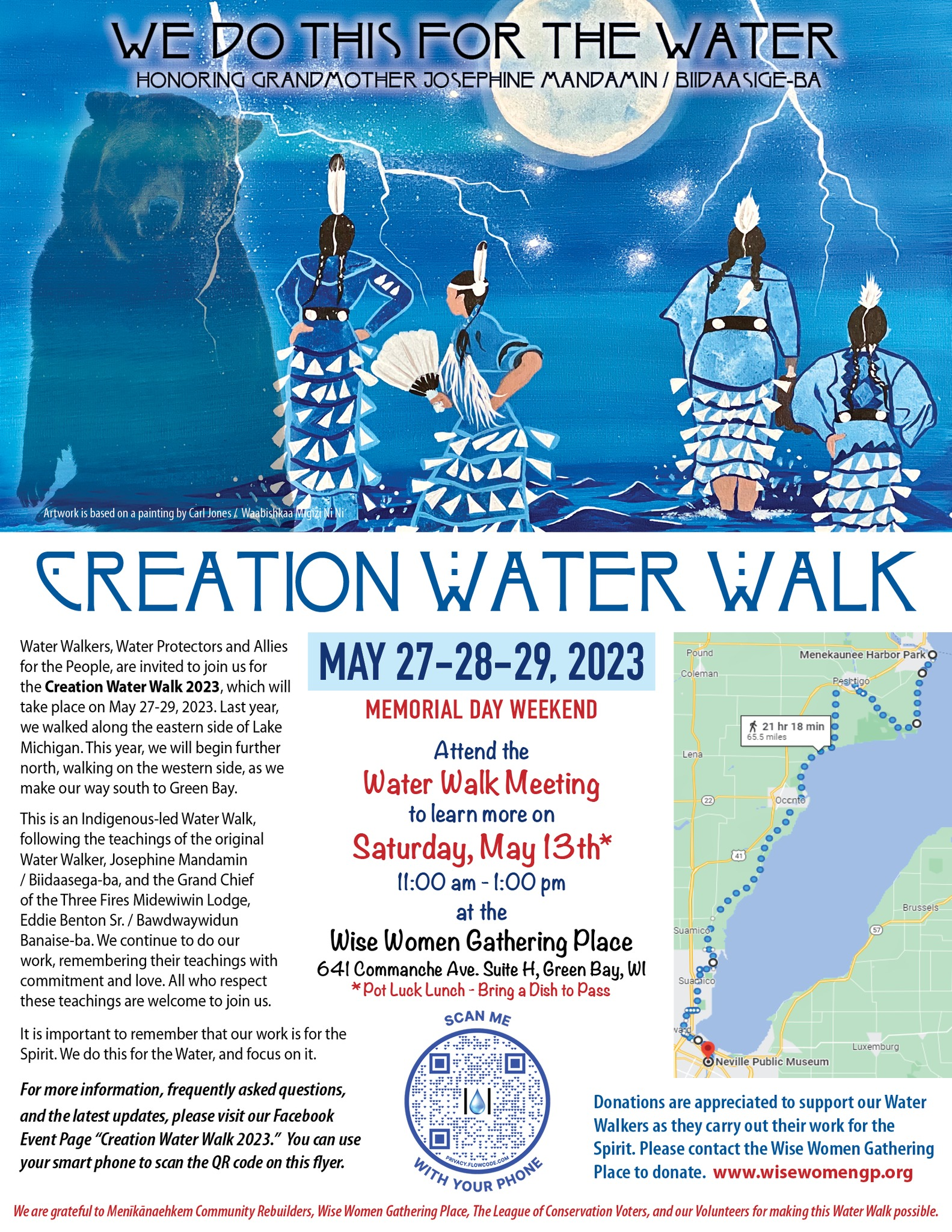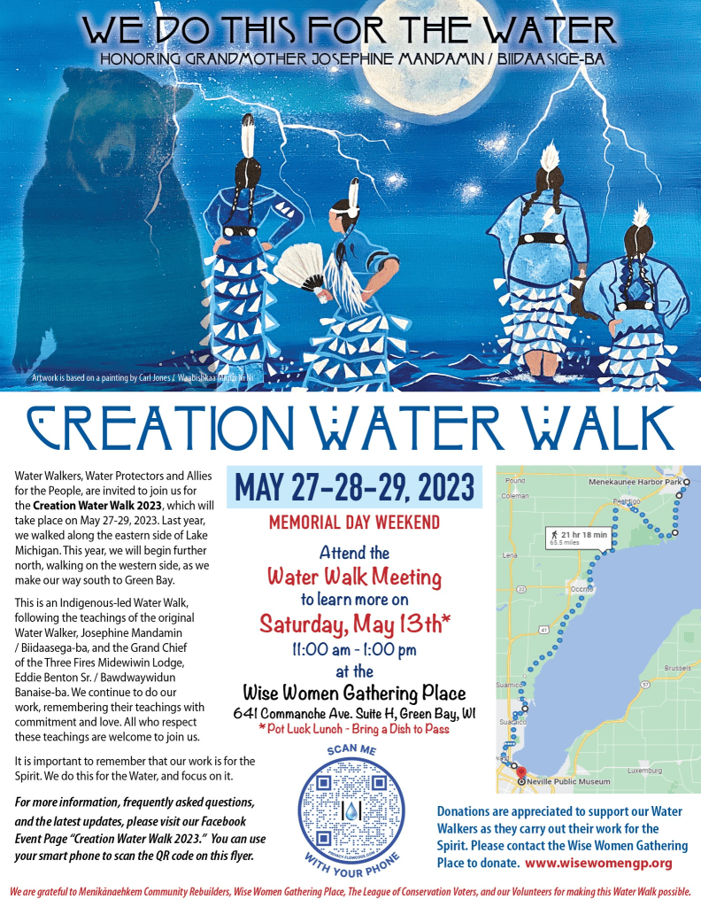Water Walkers, Water Protectors and Allies for the People, are invited to join us for the Creation Water Walk 2023, which will take place on May 27-29, 2023. Last year, we walked along the eastern side of Lake Michigan. This year, we will begin further north, walking on the western side, as we make our way south to Green Bay.