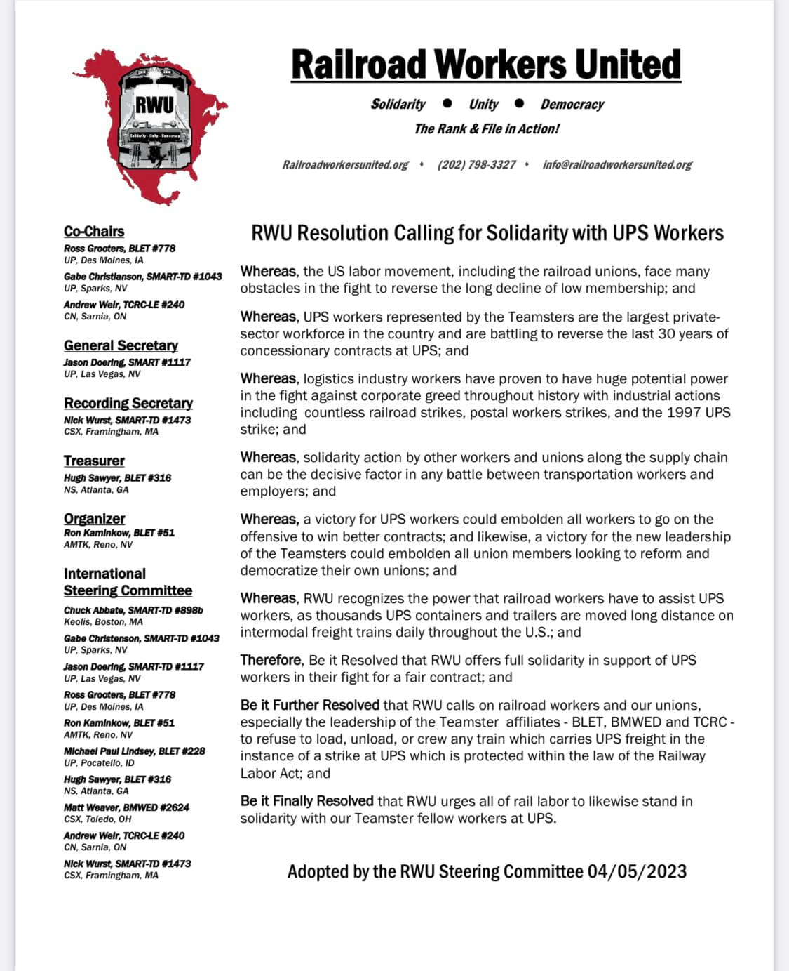 Categories Uncategorized Railroad Workers United (RWU): Resolution Calling for Solidarity with UPS Workers! Post author By wibailoutpeople Post date April 21, 2023 Railroad Workers United Share this: Click to share on X (Opens in new window) X Click to share on Facebook (Opens in new window) Facebook Like Loading... Related ← Teamsters in Wisconsin and Nationwide Escalate UPS Contract Campaign Activities → We Rise Fighting! Labor Podcast – April 16, 2023 Edition