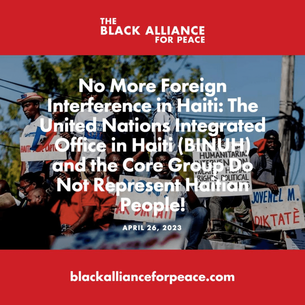 The Haiti/Americas Team of the Black Alliance for Peace (BAP) and BAP member organization in Haiti, MOLEGHAF (Mouvement National pour la Liberté et L’égalité des Haïtiens pour la Fraternité or National Movement for Liberty and Equality of Haitians for Fraternity), denounce the Core Group’s and BINUH’s continued occupation of Haiti as well as their ongoing actions to undermine Haiti’s democracy and sovereignty.