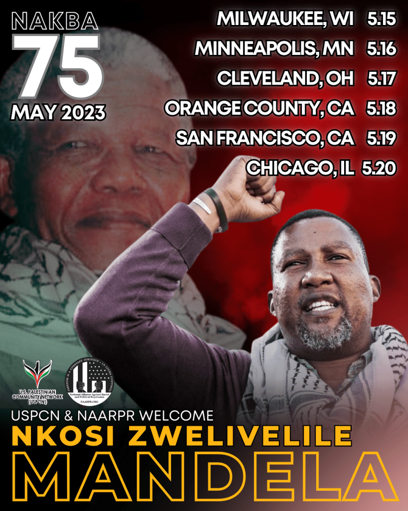 To commemorate the Nakba, the U.S. Palestinian Community Network (USPCN) and the National Alliance Against Racist and Political Repression (NAARPR) are organizing a U.S. Nakba Day 75 tour, to take place from May 15th – May 20th, 2023, featuring honored guest Chief Nkosi Zwelivelile Mandela, elected member of the South African National Assembly representing the African National Congress – and grandson of the late Nelson Mandela – as the tour’s keynote speaker.