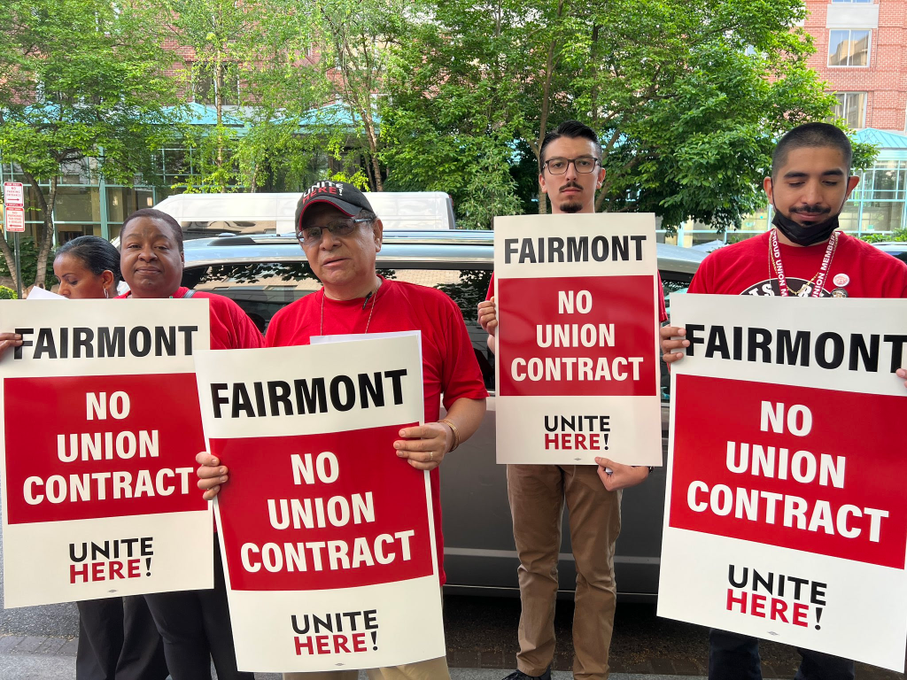 Workers at the Fairmont Washington DC, Georgetown, operated by Accor, are not protected by a union contract. Local 25 has negotiated contract with other hotels that include 100% employer-paid healthcare, employer-funded fixed-benefit pensions, protected days off, overtime pay, room quotas for housekeepers, and schedules in advance. Fairmont workers picketed throughout the week last week for a union contract.