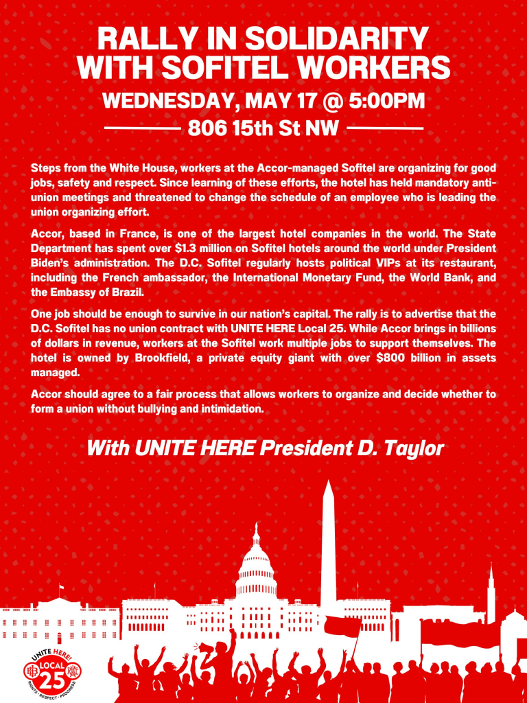WEDNESDAY: This Wednesday, May 17 at 5:00pm, U.S. Representatives Bennie G. Thompson, Brendan Boyle, and Ro Khanna will join Fairmont workers on the picket line (806 15th St. NW, Washington DC).