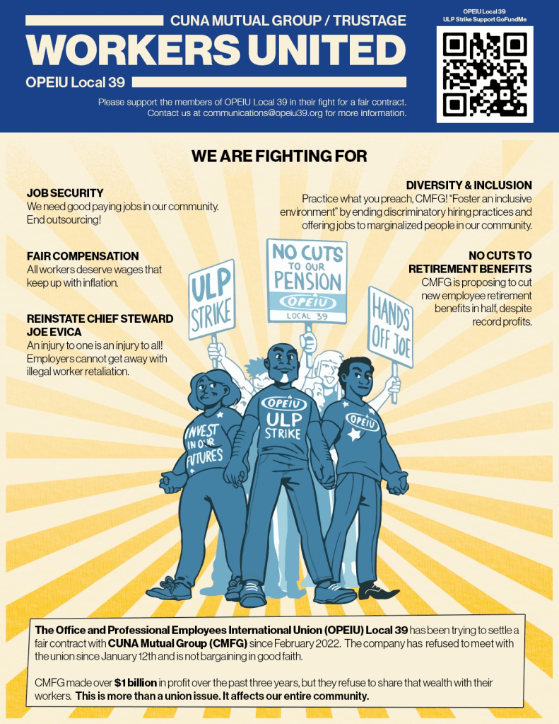 More than 400 OPEIU Local 39 members at CUNA Mutual Group in Madison, Wisconsin are going on strike Friday, May 19, 2023. – Show your support for their fight for a #FairContractNow at the link below #CMFGStrike #TruStageStrike #CantTrustTruStage