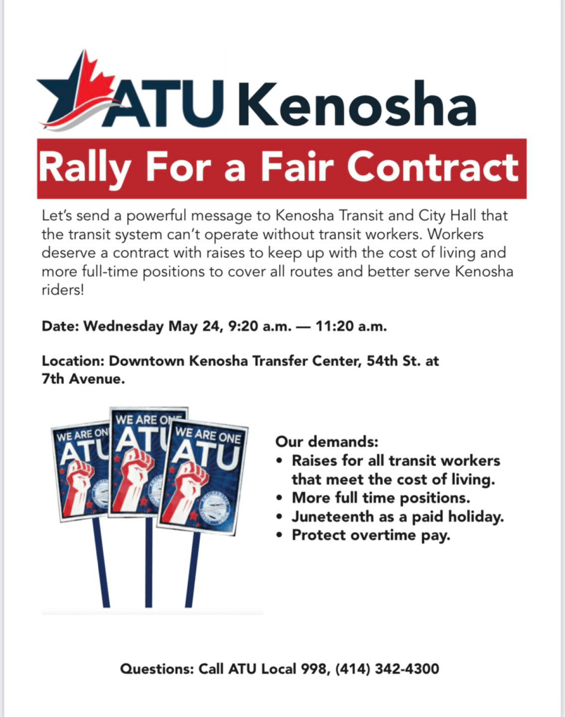Categories Uncategorized Amalgamated Transit Union (ATU) Kenosha, May 24, 2023 – Rally for a Just Contract! Post author By wibailoutpeople Post date May 22, 2023 Share this: Click to share on X (Opens in new window) X Click to share on Facebook (Opens in new window) Facebook Like Loading... Related ← National Nurses United celebrates re-introduction of Medicare For All → Madison, WI: OPEIU 39-TRUSTAGE (CUNA) STRIKE ENTERS DAY THREE – COMPANY SURVEILS STRIKERS; DATES SET FOR NEGOTIATIONS