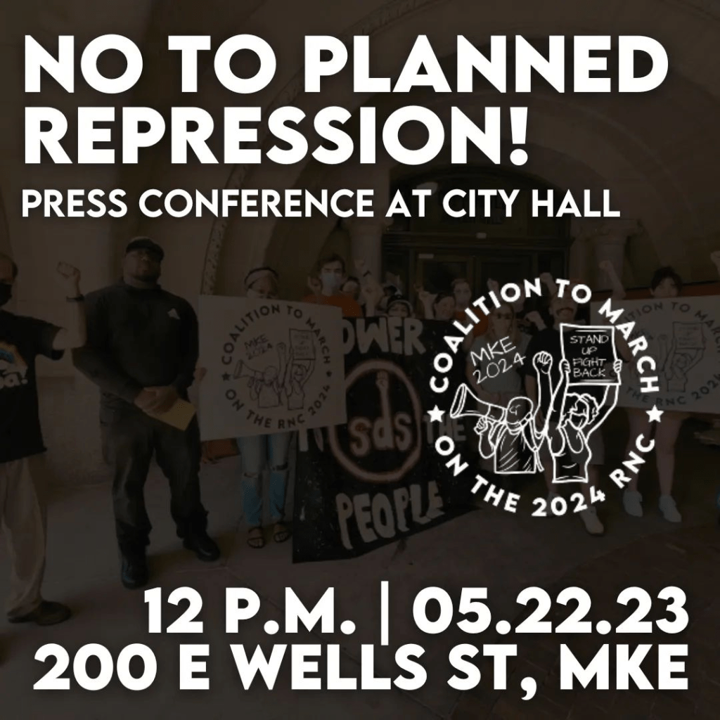 Categories Uncategorized Milwaukee, May 22, 2023: No to Planned State Repression at the RNC! – Press Conference at City Hall Post author By wibailoutpeople Post date May 22, 2023 Coalition to March on the RNC 2024 Share this: Click to share on X (Opens in new window) X Click to share on Facebook (Opens in new window) Facebook Like Loading... Related ← Fighting Words! News from the People’s Struggles Worldwide! → Milwaukee, May 25, 2023: Vigil to Commemorate George Floyd