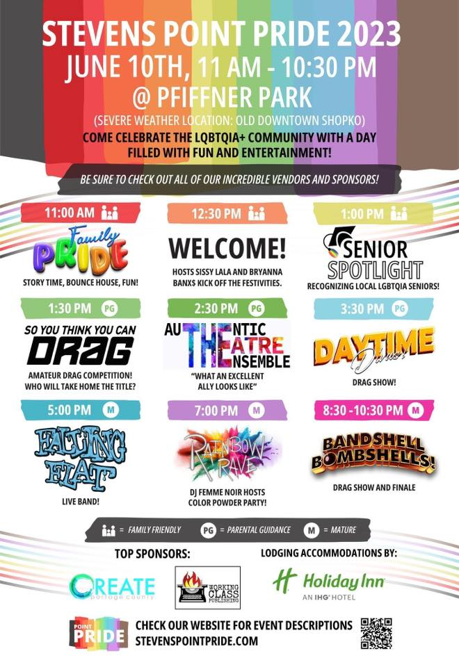 Categories Uncategorized Stevens Point PRIDE June 10, 2023 Post author By wibailoutpeople Post date May 22, 2023 Event: https://fb.me/e/4tcmqnUcy Stevens Point Pride Share this: Click to share on X (Opens in new window) X Click to share on Facebook (Opens in new window) Facebook Like Loading... Related ← Milwaukee, May 28, 2023: Ms. Lucille Berrien Mural Unveiling → Workers rally for a contract at Sofitel, one of the Biden Administration’s preferred hotel brands