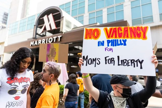 Categories Uncategorized Hell NO to ‘Moms For Liberty’ National Conference in Philly! – Stop the Racist Bigots! Post author By wibailoutpeople Post date May 24, 2023 Protesters on May 12, 2023 demand the Philadelphia Marriott Downtown cancel reservation for the ‘Moms for Liberty’ national summit. (Photo Credit: Tyger Williams) ACT UP Philadelphia Source Watch research for the right-wing Moms for Liberty: https://www.sourcewatch.org/index.php?title=Moms_for_Liberty Share this: Share on X (Opens in new window) X Share on Facebook (Opens in new window) Facebook Like Loading... Related ← Tell Nationwide: Stop Cop City! → OPEIU Local 39 MEMBERS AT TRUSTAGE/CUNA MUTUAL GROUP VOTE TO EXTEND STRIKE IN MADISON