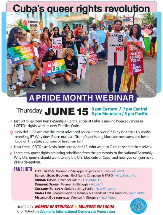 | Pride Month Webinar – Cuba’s Queer Rights Revolution Report Back Eyewitness Cuba! Thursday, June 15 CLICK TO REGISTER Thursday, June 15 — 8 pm Eastern, 7 pm Central, 6 pm Mountain, 5 pm Pacific • Just 90 miles from Ron DeSantis’s Florida, socialist Cuba is making huge advances in LGBTQ+ rights with its new Families Code. * How did Cuba achieve the ‘most advanced policy in the world’? *Why isn’t the U.S. media reporting it? *Why does Biden maintain Trump’s punishing blockade measures and keep Cuba on the state sponsors of terrorism list? • Hear from LGBTQ+ activists from across the U.S. who went to Cuba to see for themselves. *Learn how queer rights are being prioritized from the grassroots to the National Assembly. *Why U.S. queers should work to end the U.S. blockade of Cuba, and how you can join next year’s Women In Struggle delegation. P A N E L I S T S Lizz Toledo Women in Struggle-Mujeres en Lucha • Atlanta Serena Sojic-Borne Real Name Campaign & FRSO • New Orleans Jordan David Lavender Guard • Los Angeles Deirdre Deans Women in Struggle • Atlanta Gregory Esteven Socialist Unity Party • New Orleans Kiana Fok Peoples Power Assembly & Friends of Latin America • Baltimore Melinda Butterfield Women in Struggle • New York You must register to attend Register |