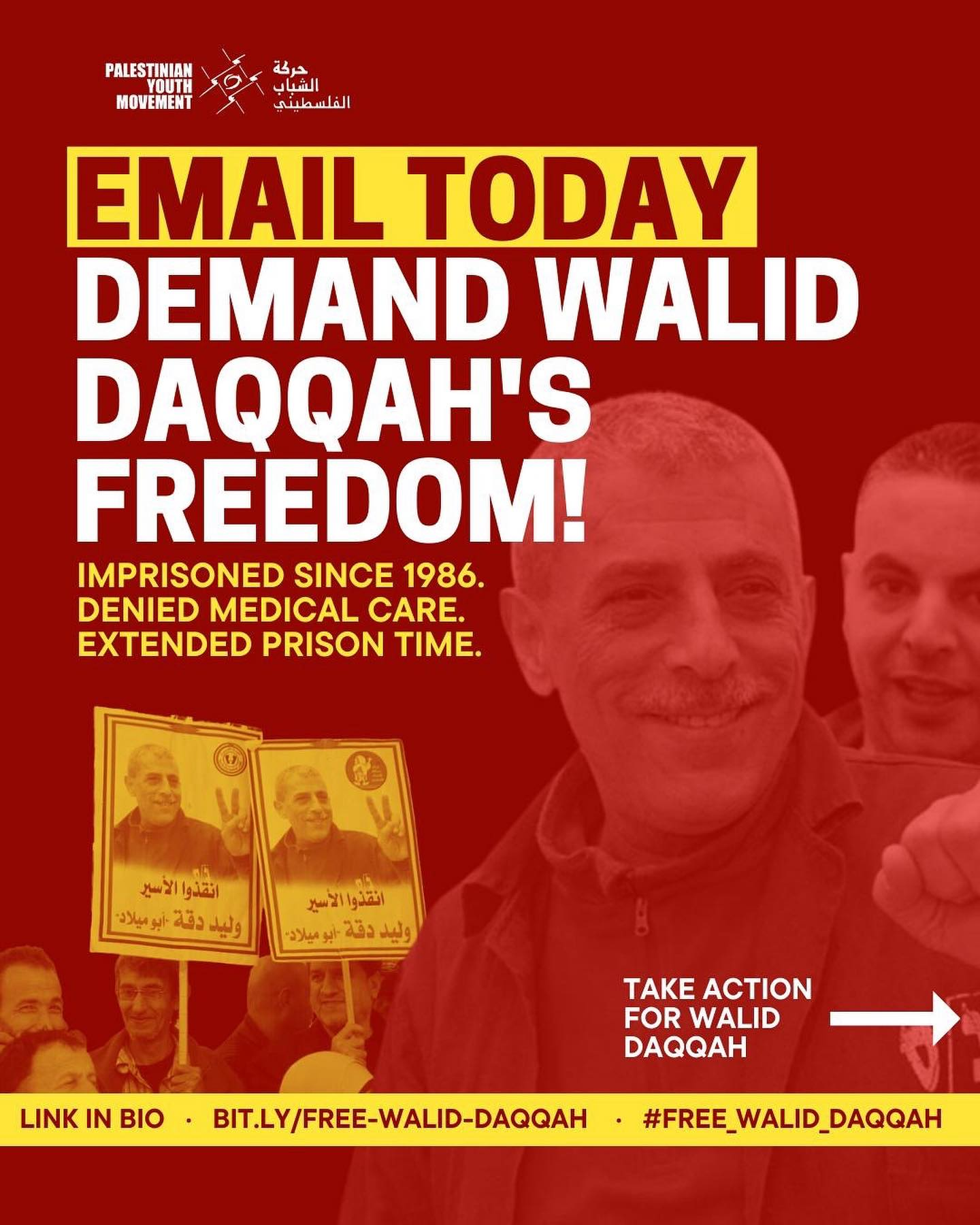 Walid Daqqah is a Palestinian writer and organizer who has been in Zionists prisons since 1986, making him one of one of the longest-held political prisoners in Zionist detention. Last year, Daqqah was diagnosed with Myelofibrosis, a rare form of bone marrow cancer that disrupts the body’s normal production of blood cells. Israel refuses to release Walid Daqqah or provide him access to life-saving medicine and treatment which has led to increased deterioration in his health. Earlier this year, Daqqah underwent surgery to remove part of his lung. He was briefly placed in intensive care, but then Zionist authorities quickly transferred him back to his prison clinic, again denying him proper treatment. The Zionist occupation is killing Daqqah through deliberate medical negligence. We are calling on international actors like the United Nations and International Committee for the Red Cross to take action! Walid’s fate is in our hands. Send an email expressing your concern for Walid’s condition today.