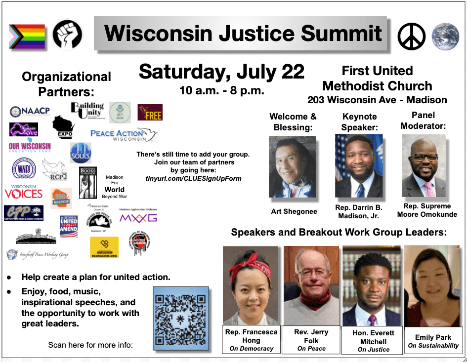 | The “Wisconsin Justice Summit” Saturday, July 22 10 am – 8 pm First United Methodist Church, 302 Wisconsin Ave. Madison WI Organized by Building Unity, member group of WNPJ. Justice activists from all over WI are coming together to forge a strategic plan that will include action for Peace, Justice, Sustainability, and Democracy! The following leaders have thus far signed on to help guide it: –Judge Everett Mitchell –Rep Francesca Hong –Emily Park, 350 Wisconsin –Rev. Jerry Folk, Interfaith Peace Working Group To help us build momentum for the July 22nd Wisconsin Justice Summit, we have launched the Campaign for Love, Unity, and Equity (C.L.U.E.) Please endorse this campaign and the Wisconsin Justice Summit by going here: https://tinyurl.com/CLUESignUpForm Using our “Flier for All of Us” we are showing up and supporting the actions of our partners in hopes of building powerful movement/momentum for the summit on July 22. Register to take part in the summit by going here: https://tinyurl.com/JusticeSummitRegistration Share our Facebook Event: https://fb.me/e/RLg68QZ8 Visit and share this Summit info page: https://tinyurl.com/WIJusticeSummitInfo For more information about how you can help make this Summit an exciting turning point for peace, justice, sustainability and real democracy, call Building Unity at 608-630-3633. Need Madison housing, or can you host in Madison? Call Tim at 608-630-3633. |